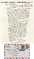 MILLER HenryLettre autographe, signée « Henry », adressée à Rudolf Springer, à la Galerie Springer, à Berlin. Pacific Palisades, Californie, 6 décembre 1976 ; 1 page oblongue in-8° à son en-tête imprimé, enveloppe timbrée jointe ; en anglais. Miller écrit au nom d’un ami qui voudrait étudier ou travailler avec Marino Marini. Est-il toujours vivant, et si oui, Springer pourrait-il lui donner son adresse en Italie ? Lui-même est maintenant aveugle d’un œil et ne peint plus. Il écrit un peu, mais ne lit presque jamais de livres.