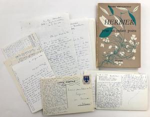 MENANTEAU PierreEnsemble de 12 lettres et 16 cartes autographes signées, adressées au poète Jean Stiénon du Pré. 1954-1984 ; in-8° ou in-12. Très intéressante correspondance très dense sur la poésie. Il est question que douvrages de poésie, de critiques de livres, de vers échangés « Le Bonheur est un dieu qui marche les mains videsEt regarde la vie avec des yeux baissés », de citations échangées « Jaime aussi cette autre citation de Léonard de Vinci : La chambre dune petite habitation rajuste lesprit. [ ] Je me méfie beaucoup des miroirs et jadis jai remarqué que les mères, en Vendée, ne voulaient pas que leurs enfants y contemplent leurs doutes...». ces lettres sont empreintes dadmiration pour la poésie de Jean Stiénon du Pré.On joint un ouvrage dédicacé de Pierre Menanteau « Herbier pour un enfant poète », avec une belle dédicace à Jean Stiénon du Pré.On joint de Jean DENOËL : Correspondance de 6 lettres (4 LAS et 2 LS) au même.