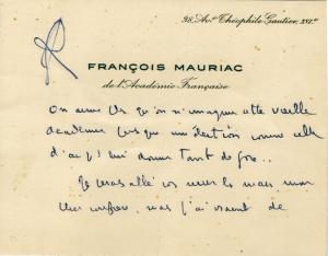 MAURIAC FrançoisCarte autographe signée de ses initiales sur carte à son nom gravé [adressée à J. Carcopino]. [1952 ?] ; 2 pages in-32 oblongues. Il est fait sans doute allusion à l’élection du maréchal Juin à l’Académie française le 20 novembre 1952, par 25 voix — une véritable élection de maréchal —, au fauteuil de Jean Tharaud.« On aime plus qu’on imagine cette vieille académie lorsqu’une élection comme celle d’aujourd’hui donne tant de joie... Je serais allé vous serrer la main, mon cher confrère, mais j’ai craint de me trouver seul avec un maréchal dans votre ascenseur ! Je suis heureux et fier d’être votre confrère. F.M. »