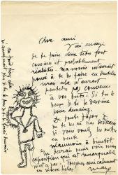 MAYO AntoineLettre autographe signée, adressée à A. Duchemin. Sans date ; 1 page in-4°, illustrée d’un amusant dessin, représentant un curieux personnage debout. « J’ai essayé de te faire deux têtes fort cousines et probablement réalistes. Ma manie m’aurait poussé à te les faire en dentelles mais cela n’aurait peut-être pas convenu à vos buts. Si tu le veux je te le dessine pour demaing [sic]. De toute façon, je ne te les ai pas dédicacées, si vous voulez les mettre en vente. » Belle lettre illustrée.