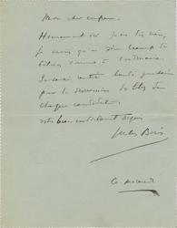 BOIS JulesBillet autographe signé, adressé à Gabriel Dauchet au Petit Journal. « Ce mercredi » ; 1 page in-16 avec adresse timbrée au dos. « Heureusement ici je vis très bien, je crois qu'on dira beaucoup de bêtises comme à l'ordinaire. Je serai rentré lundi prochain pour la discussion des titres de chaque candidat. »