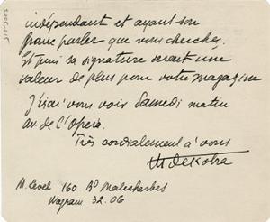 DEKOBRA Maurice (Maurice Tessier, dit)Carte autographe signée, adressée à M. André Paysan. « Mercredi » ; 10,5 x 12,5 cm. Carte gravée à son adresse et enveloppe timbrée jointe. « Pour votre critique dramatique, vous devriez causer avec Maurice Revel que vous connaissez. Je lui en ai parlé et cela l'intéresserait en principe. Je crois qu'il serait précisément le critique non professionnel indépendant et ayant son franc parler que vous cherchez. Et puis sa signature serait une valeur de plus pour votre magazine. »