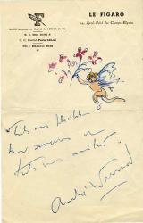 WARNODPièce signée. Sans date ; 1 page in-8° avec dessin en couleurs représentant un ange portant un bouquet de fleurs. En-tête du Figaro. « Toutes mes félicitations bien sincères et toutes mes amitiés. »