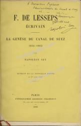 NEY Napoléon« F. de Lesseps, écrivain — La genèse du Canal de Suez 1854-1862 ». « Extrait de la nouvelle revue du 1er avril 1885 ». Ed. Georges Chamerot, Paris, 1885 ; in-4°, reliure en chagrin noir, titre doré. Bel envoi autographe signé adressé à M. Peghoux, administrateur du canal de Suez. Bel exemplaire.