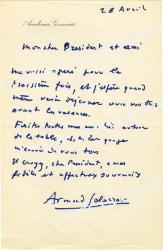 SALACROU ArmandLettre autographe signée, adressée à Hervé Bazin, président de l’Académie Goncourt. 28 avril ; 1 page in-8°. « Me voici opéré pour la troisième fois, et j’espère quand même venir déjeuner avec vous tous avant les vacances. Faites toutes mes amitiés autour de la table et dites leur que je m’ennuie de vous tous. »