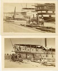 PHOTOGRAPHIES.Ensemble de 4 photographies prises sur un chantier naval. Fin XIXe -début XXe siècle ; 17,5 X 10 cm chaque. Cliché représentant des navires du XVIIIe siècle dans un port français, avec des ouvriers (ou des marins, en premier plan).