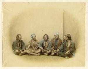 PHOTOGRAPHIE— ASIEPhotographie XIXe siècle en couleurs; 20 x 26 cm, sur papier albuminé, trace de pliure à droite. Scène de 6 personnages assis.