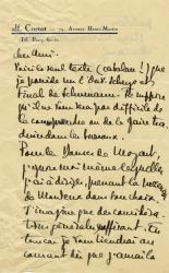 CORTOT AlfredLettre autographe signée. Sans date ; 1 page 1/4 in-8°. «Voici le seul texte (catalan !) que je possède l’Ouv-Scherzo et Finale [l’Ouverture, Scherzo et Finale pour orchestre op. 52,] de Schumann. Je suppose qu'il ne vous sera pas difficile de le comprendre ou de le faire traduire dans les bureaux. Pour la Dance de Mozart, j’ignore moi-même laquelle j’ai à diriger, prenant la succession de Manteux dans Buchaix. J’imagine que des considérations générales suffisent. En tous cas je vous teindrai au courant dès que j’aurai la partition. »