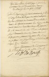 DU BOURGPièce signée. Strasbourg, 14 septembre 1728 ; 1 page in-folio. « Copie dune lettre escrite par M r de Breteuil à M r le M al Du Bourg, à Marly le 13 fevrier 1725 ». Sur une pension octroyée par le roi.