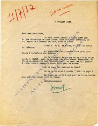 SALACROU ArmandLettre signée « Armand », adressée à Guillaume. [Vieux-Port], 5 juillet 1932 ; 1 page in-4°. « Je suis actuellement à Vieux-Port par Sainte-Opportune-La-Mare (Eure) dans une cour normande, où tu seras le bienvenu cet été, avec ta femme. C’est à 50 km de Rouen, et sur les bords de la Seine. Je travaille et j’espère être prêt pour faire l’ouverture des Quinze. […] Si tu as un manuscrit des Frénétiques, tu peux lui donner à lire, cela n’engage à rien. »