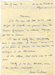COUTAUD LucienLettre autographe signée, adressée à Jean René Thomé. Paris, 27 mars 1957 ; 1 page in-4°. « J’ai bien reçu votre lettre du 22, votre projet de présenter mes gravures dans le courrier graphique m’intéresse beaucoup, je vous en remercie. Si vous le voulez bien, vous pourrez venir à mon atelier le lundi 1er avril à 11 h, je me ferais un plaisir de vous montrer des estampes et des illustrations. »