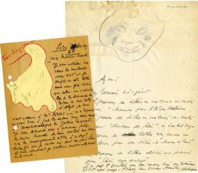 TOUCHAGUES Louis2 lettres autographes signées, adressées à M. Nacenta, directeur de la galerie Charpentier. Trous d’archivage : — Paris, le 27 décembre 1945 ; 1 page 1/2 in-8°, avec collage représentant une femme. « Je vous adresse mes voeux les meilleurs pour 1946 et je profite de cette lettre pour vous faire savoir que selon vos indications lors de la demande du retour de mes toiles d’Alger, je me suis adressé à M. Parisot qui m’a répondu n’avoir rien à faire là-dedans, mes toiles ayant été réceptionnées par la galerie Charpentier. Je vous demande donc à nouveau, Cher Monsieur Nacenta de bien vouloir me donner les renseignements utiles à ce sujet à toute fin que je sache où sont ces peintures et voir comment je pourrai personnellement intervenir. »— Sans date ; 1 page in-4°, avec dessin en en-tête. « Veuillez trouver ci-joint 2 épreuves de lithos en couleurs mi-testés pour “Chansons pour Elle” de Verlaine, 2 épreuves de lilthos en ccouleurs mi-textés pour “Charmes de Paris” de Léon Paul Farguel ».
