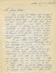 ÈVE JeanLettre autographe signée adressée à Monsieur Nacenta. Levallois-Perret, 12 janvier 1981; 2 pages in-4°, 2 trous d’archivage. « Merci d’avoir fait diligence pour m’envoyer le règlement de ma toile vendue au Salon es Tuileries au mois de novembre dernier. Cet argent me vient bien à point, car en effet, ainsi que Monsieur Eymin vous l’a expliqué, je suis tombé malade à la campagne à Saint Rémy par Ecos (Eure) et dans l’obligation de rentrer chez moi pour me soigner et suivre un régime sévère. Le froid, les soucis , les tourments et les difficultés de la vie présente y sont pour quelques choses et j’ai dû interrompre toutes activité artistique pour me soigner sérieusement. [...] Lors de la clôture du Salon des Tuileries vous m’avez prié de vous confier 1 ou 2 toiles en me disant que vous aimerez beaucoup ce que je faisais. Je suis en mesure de vous faire poster, si vous êtes toujours d’accord, 2 toiles de 10 Figures encadrées qui représente des paysages de la Vallée de l’Epte, de cette région que j’adore et don le tableau que vous venez de vendre, était représentatif. »