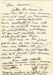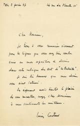 COUTAUD LucienLettre autographe signée, adressée à M. Lassaigne. Paris, le 2 février 1947 ; 1 page in-8°. « Je tiens à vous remercier vivement pour les lignes que vous avez bien voulu écrire sur mon exposition de dessins dans votre rubriques des arts de “ La Bataille”. Je suis très heureux que mes dessins vous aient intéressé. »