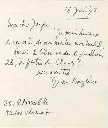 BAZAINE JeanLettre autographe signée [adressée au critique d’art Jacques Lassaigne]. 16 juin 1978 ; 1 page in-4°.« Je serais heureux de vous voir, de vous montrer mon travail. Serais-tu libre vendredi prochain, 23, à partir de 6 heures ? »