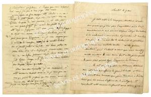 BIOT Jean-BaptisteLettre autographe signée. Nointel, par Clermont , le 19 juillet 1828 ; 2 pages in-4°. « Je vous adresse par une voie sûre, la plus grande partie du manuscrit nécessaire pour remplir les neuf pages et demie que vous avez eu la complaisance de me réserver à la fin de mon mémoire qui commence le volume — je dis la plus grande partie parce que j’ai voulu me réserver la latitude nécessaire pour tomber juste dans l’espace que vous m’avez accordé. […] Je vous supplie de faire composer cette addition et de me l’envoyer le plus tôt possible, car je m’en vais entrer dans mes examens, le quatre du mois prochain. Et c’est alors pour moi une grande fatigue qui me rend bien pénible de faire autre chose en conséquence. »Est jointe une lettre de son épouse.
