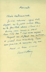 VALÉRY Paul (Ambroise-Paul, dit)Lettre autographe signée adressée à Mlle germaine Decaris. Paris, mercredi (1943) ; 1 page in-8°, enveloppe timbrée. P. Valery recherche un cahier après la visite de cette demoiselle. « Je n’ai retrouvé, après votre départ, ni le petit cahier bleu ni les feuillets classés (Faust) Auriez-vous remis ce stock dans votre sac? c‘est mon espoir ! Auquel cas, il faut me rassurer, et quand vous viendrez dans mon quartier, le remettre chez moi. » Ecrit au crayon au dos de l’enveloppe : « Je lui téléphone demain matin - Rassurez-vous J’ai tout retrouvé vraiment par hasard cela avait glissé derrière moi. Je m’excuse de vous avoir alarmé. »