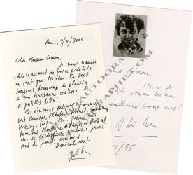 SAER Juan José2 pièces autographes signées, adressées à Gérard Leman : — Photographie dédicacée. 1er décembre 1995; sur une page in-8°. « Merci de votre fidélité comme lecteur. Et meilleurs vœux aussi ! »— Lettre autographe signée. Paris, 9 avril 2003 ; 1 page in-12, en français. « Je vous remercie chaleureusement de votre fidélité en tant que lecteur. Ça fait toujours plaisir à un écrivain de recevoir de si gentilles lettres. Mes écrivains préférés (français) sont Stendhal, Flaubert, Proust, Baudelaire, Valéry, Sartre, etc. J’aime aussi beaucoup Montaigne, Pascal et Diderot, etc. etc. Difficile de choisir parmi tant de grands écrivains. »