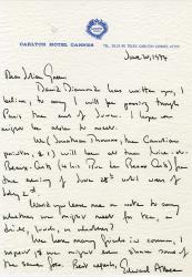 ALBEE EdwardLettre autographe signée, adressée à Julien Green. Cannes 20 juin 1974 ; 1 page in-8°, en anglais. En-tête gravé du « Carlton Hôtel - Cannes ».Comme a dû lannoncer à Julien Green le compositeur David Diamond [1915-2005], Albee souhaiterait le rencontrer durant son séjour à Paris, avec son compagnon le peintre canadien Jonathan Thomas : ils ont beaucoup damis et sans doute beaucoup dennemis en commun. « Would you leave me a note to say whether we might meet for tea, a drink, lunch, or whatever ? We have many friends in common, I suspect, and we might ever share some of the same foes. »