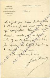 SIMON Jules (Jules François Simon Suisse, dit)Lettre autographe signée. [Paris, 14 novembre 1870] ; 1 page in-8°. « Les départs en ballons sont retenus à l’avance. Je vais voir ce soir ce qui est possible. Venez me voir demain matin, 15 novembre, entre 9 et 10 heures, je vous dirai la réponse. Les ballons dépendent du ministre des Finances. »
