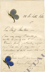 BLUMENTHAL JacquesLettre autographe signée, adressée à un « maestro ». « Thursday » ; 1 page in-16, en anglais sur papier illustré de deux papillons gris et bleu sur la lettre. Charmante missive. « I was very sorry I could go neither to your’s nor to Princess Viano’s party yesterday night as I had one of my usual headaches and did not step out at all. Yours most sincerely. Jacques Blumenthal. »