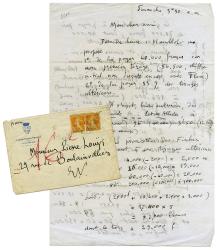 FARRÈRE Claude (Frédéric-Charles Bargone, dit)Lettre autographe, signée « Claude », adressée à Pierre Louÿs. « Dimanche, 3 h 30 a.m.» ; 2 pages in-4°, enveloppe timbrée de Paris avec cachet du 12 septembre 1915.Longue lettre d’ordre financier sur le prix de ses tirages. « Dernière heure : Humblot me propose 1° de lui payer 40 000 francs sur mon premier tirage (86 800, chiffre initial, non discuté encore avec Flam.)2° de lui payer 33 % des tirages ultérieurs.Il s’agit, bien entendu, des cinq Fumées ... Petites Alliées, à 50 c. (100 000) 95 c. (40 000) 3 f50 (12 000) 5 f.(2 000 exempl.). […] Ce qui reviendrait à payer près de 70 000 francs, dont 40 000 au comptant, ma liberté. Pensez-y et conseillez-moi. »Il doit s’agir ici de rééditions populaires d’œuvres de Farrère chez Ollendorff et Flammarion, car Alfred Humblot était directeur des éditions en question (il est resté célèbre par son refus, en 1913, du manuscrit de Du côté de chez Swann). On voit que Farrère était un redoutable homme d’affaires et savait défendre ses intérêts, en demandant souvent conseil à Louÿs. À la fin de la lettre, Farrère évoque Simone : probablement Simone Puget, une des maîtresses de Farrère, lequel échangeait à son sujet des confidences intimes avec Louÿs.