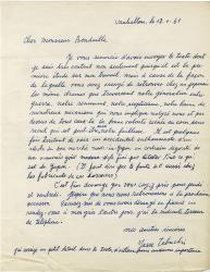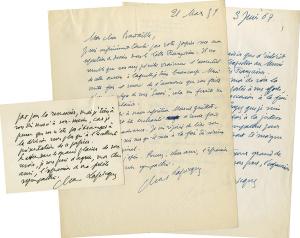 LAPICQUE CharlesCorrespondance de 2 lettres et dune carte autographes signées, adressées au critique dart Georges Boudaille. Lettre autographe signée. 21 mars 1959 ; 1 page in-4°. « Je suis infiniment touché par votre papier sur mon exposition de dessins dans les Lettres Françaises. Il me semble que vous avez présenté lessentiel de cette oeuvre à laquelle je tiens beaucoup. Merci mille fois et merci pour lannonce que vous faites dune analyse de mes Essais ; cela me ferait un grand plaisir. Jai rencontré à mon exposition Marcel Guillot, qui ma dit être enchanté davoir fait votre connaissance. je me réjouis de lire son article ; je suis sur quil sera à la fois très sérieux et très original. » Carte autographe signée. 24 novembre 1960 ; 2 pages in-16 oblongues.« Jai bien regretté de vous manquer lors de votre passage à mon exposition galerie Villand Galanis. Je suis enchanté de larticle - interview [ ] dans les Lettres Françaises » Lettre autographe signée. 3 juin 1967 ; 1 page in-4°. « Jai lu avec autant de plaisir que dintérêt votre bel article sur ma Rétrospective au Musée dArt Moderne, dans les Lettres Françaises.Cest un grand réconfort pour moi de voir la fidélité que vous avez toujours portée à mes efforts, se manifester dans cette occasion à la fois glorieuse et redoutable. Croyez bien que je suis infiniment sensible à la fois à la justesse de votre analyse et à la sympathie pour loeuvre et pour lartiste, dont témoigne votre importante chronique. »