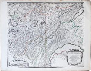 COMTÉ DE BOURGOGNE ou FRANCHE-COMTÉ : Orgelet, Lons-Le-Saunier, Poligny, Arbois, Salins, PontarlierCarte gravée, dressée par le Sr Robert, géographe ordinaire du Roi. 1749; 51 x 65 cm, trace de mouillure dans la partie du haut au centre, rehauts d’aquarelle. Le titre est en bas et à droite dans un cartouche ornemental : « Partie Méridionale du comté de Bourgogne ou Franche-Comté, où sont les Bailliages de Orgelet, Lons-Le-Saunier, Poligny, Arbois, Salins, Pontarlier, les terres de St Claude et partie des bailliages de Dole et Dornans.»