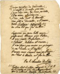 PIIS Antoine-Pierre-Augustin, chevallier dePièce de vers autographe signée « Par le chevalier de Piis ». 1 page in-4°. Épigramme royaliste.« Quoique inventeur du Vaudeville,Je compte à sa caisse pour rien !Je ne suis rien en cour, en ville Pas même AcadémicienSire, celui dont la MusetteVous plût à Versaille, à Brunoi, Votre Secrétaire-interprèteNe sera tôt que fou du Roi ?Supposons que mon luth encorePuisse avoir Momus comme Patron,Et que jimite RoquelaureTriboulet, Debièvre et Scarron ;il nen faut pas moins que je craigneDe me borner à cet emploi,Puisque nous sommes dans un RègneOù tout le monde est fou du Roi. »