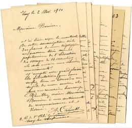 CRAUK AdolpheEnsemble de 9 lettres autographes signées, adressées à M. Bernier. Issy-les-Moulineaux, 1910 ; 14 pages in-12. Au sujet de parchemins. « Certes le parchemin rend beaucoup mieux une uvre de gravure que toute autre épreuve ; la différence est très grande ; le seul inconvénient du parchemin, c'est qu'il coûte très cher, aussi on en tire que très peu, c'est ce qui augmente la valeur des épreuves. Au sujet du parchemin de la Vierge que vous désiriez bien posséder aussi mais vous trouvez la somme un peu trop élevée, je dois vous dire franchement que c'est le prix que j'ai vendu les deux autres et que, vu le tirage restreint des parchemins, cela vaut grandement 300 F chaque. »
