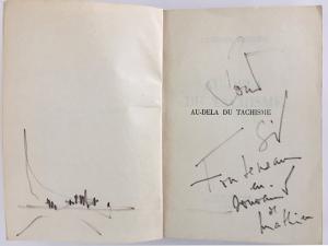 MATHIEU Georges« Au-delà du Tachisme ». René Julliard, Paris, 1963 ; 20 x 14 cm, broché, couverture salie. Envoi autographe signé avec petit dessin. « Pour Gil Fonteneau en souvenir de Mathieu. » Accompagné d'un dessin au feutre sur la page de gauche.
