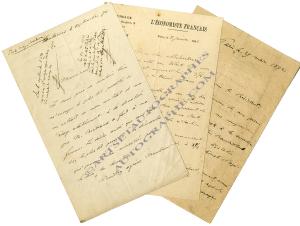 LEROY-BEAULIEU Paul3 lettre autographe signées :— Coutances, 4 septembre 1870 ; 1 page 1/2 in-8°. « Je vous prie de vouloir bien m’envoyer le plus tôt possible ici un extrait de mon contrat de mariage relativement à la donation que M. Bertrand a fait à ma femme. Je désire aussi que vous fassiez le plus tôt possible les démarches qui peuvent être nécessitées par le décès du donateur. »— Paris, 29 mars 1892 ; 4 pages in-8°. « J’ai l’honneur de vous prier de vouloir bien me comprendre parmi les candidats à la succession du très regretté M. Baudrillard de la Société nationale d’agriculture. [...] Permettez-moi d’ajouter, monsieur le Président, que je suis agriculteur pratiquant. Je cultive la vigne dans le département de l’Hérault ; je la cultive aussi, dans des proportions étendues, en Tunisie et je suis intéressé, en outre, à des exploitations agricoles des plus diverses. »— Paris, 8 janvier 1896 ; 1 page in-8°. « Je suis allé aux Débats hier vers 5 heures et aujourd’hui à 31/4, mais je n’y ai trouvé personne. [...] Je vous rappelle que vous avez bien voulu me promettre de venir m’assister le jeudi et le vendredi dans le courant de ce mois, à partir de 3 heures, étant privé de secrétaire de la rédaction en ce moment. »