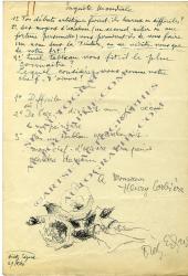 DIETZ EdzardPièce autographe signée. 29 mai 1956 ; 1 page in-4°. Réponse au critique d’art Henri Corbière à son enquête mondiale Maximes de vie des grands peintres contemporains.« 1. Difficile. 2. Dès l’âge de dix-huit ans, j’ai vécu de ma peinture. 3. Pas un tableau spécialement. Mon chef-d’œuvre sera peint peut-être demain. » Sous les résultats de l’enquête, il a dessiné un bouquet de fleurs.Henri CORBIÈRE [1888 - 1980] était un journaliste et critique français.