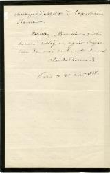 BERNARD ClaudeLettre autographe signée, adressée à un autre académicien. Paris, 21 avril 1868 ; 1 page 1/2 in-8°, sur papier de deuil. « J’ai reçu trop tardivement votre note pour la communiquer à l’Académie. Vous m’aviez adressé votre lettre à l’Institut d’où elle a été renvoyée. » Il lui renvoie la note intéressante sur laquelle il lui fait « une seule observation, c’est qu’étant toute philosophique, il me semble qu’elle incomberait plutôt à l’Académie des Sciences morales et politiques ».