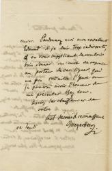 MEYERBEER GiacomoLettre autographe signée « Meyerbeer », adressée à M. Blanc. « Ce jeudi » ; 2 pages in-8°.« Vous avez oublié de me faire parvenir votre petit mot à quelle heure je pourrais me rendre chez vous pour faire les visites aux membres de la commission de l’Institut, ou votre excellente bienveillance veut bien m’accompagner pour m’appuyer de votre puissante recommandation. […] Pardonnez moi mon excellent Edmond si je suis trop indiscret en vous suppliant de vouloir bien donner un mot de réponse au porteur de ces lignes ».