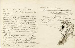 DAVID D’ANGERS RobertLettre autographe signée avec dessin, adressée à son oncle. 4 février 1876 ; 3 pages in-12. Il le félicite sur sa profession de foi qu’il faudrait envoyer au Courrier de France, qui fait campagne contre « les meubles gênants comme les Buffet ». Lui-même a la chance de voter pour M. Thiers, qu’il connaît et estime, et qui serait à sa place au fauteuil présidentiel de la Chambre. Après de nouvelles paroles encourageantes il termine par un amusant croquis d’un candidat malheureux, en habit de magistrat et à très long nez.