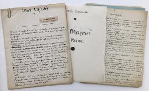 LARGUIER LéoEnsemble de 2 manuscrits autographes (dont un signé « Francis Laurière »), « Sa Majesté la Reine.» & « Leurs Majestés ». 58 pages in-4°, quelques collages et corrections.Contes de protocole et dhumour, mettant en scène des monarques et des courtisans des royaumes de Syllistrie et de Carinthie, de nos jours : Othon XXIII et son frère larchiduc Salvator, Marie-Dorothée et Christian IV, occupés damour, de sciences, dun traité de commerce et, presque toujours, de leur dignité...On joint des brouillons autographes (17 pages in-4°) et 2 coupures de presse.Provenance: Succession Léo Larguier, 2006.