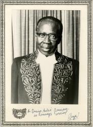 SENGHOR Léopold SédarPhotographie dédicacée. 24 x 17 cm sur un carton aux palmes académiques de 32 x 23,5 Photographie le figurant en habit d’académicien, collé sur un carton à décor de palmes académiques, dédicacée. « À Monsieur André Jouniaux en hommage cordial. »