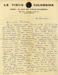 COPEAU JacquesEnsemble de 3 lettres autographes signées [adressées à Lucien Dubech]. 1923-1930 ; 4 pages -4°. 1923 : « Je pars ce soir pour Zurich. Je reviens mercredi soir. Tâchons de dîner ensemble bientôt. J’aime vous voir, mon cher Dubech, parce que vous êtes un honnête homme. Voyez-vous j’aurais voulu pouvoir être à fond avec l’A.F. Ça aurait pu arriver mais il n’y a pas moyen. Je ne prends plus Daudet au sérieux »… 18 juin 1930 : « Il n’y a plus rien à attendre des suites de la campagne à laquelle vous avez pris part si vaillamment. Moi j’avais la naïveté de croire ce qu’on me disait. Je suis informé maintenant que ce qu’on me disait n’était rien de réel. […] Je vous remercie de parler toujours si amicalement de moi sous votre double signature. […] Dites moi ce qu’on peut faire contre cette diminution de l’esprit de défense et de l’esprit tout court dont parlait hier Maurras ? […] Je ne suis pas un fainéant. Il y a un an quand on m’a parlé de donner cette maison perdue, j’ai dit : présent. On me répond que je vais à la messe et que j’ai rêvé de faire fortune au Vieux-Colombier. On me répond aussi que le théâtre national ne va pas si mal que ça, et que d’ailleurs il peut bien croire qu’on s’en fout. Alors ? »… 24 décembre sur papier à en-tête « Le Vieux Colombier » : « Je ne devrais pas laisser votre article sans une longue réponse. Mais je n’ai pas le temps. Je suis déjà au travail sur autre chose. Votre réaction ne me surprend pas extrêmement J’aime que votre esprit ait cette liberté de se retourner aussi vivement. Mais il se retourne un peu trop tout d’une pièce, je crois. Il y a de l’humeur là-dedans. Cette pièce vous a inspiré de la répugnance. Vous vous en êtes détourné. C’est bien. […] Mais du même coup vous vous condamnez à être injuste. Vous laissez tomber la plupart des éléments qui vous permettraient de juger la pièce. Influence nordique, réalisme, tranche de vie, oeuvre statique... tout cela est bientôt dit, et je crois que rien de cela n’est tout à fait vrai. Comme nos jeunes gens vous tenez pour résolu une foule de problèmes qui, à mes yeux, ne le sont pas si franchement, si définitivement. J’espère bien que nous aurons l’occasion de reparler de tout cela. Ce que je regrette c’est que vous ayez l’air, dans cet article, de déclarer que tout est perdu, de regretter d’avoir été dupe, d’avouer que cet homme là n’est pas celui que vous aviez cru, et de lui dire adieu. Je m’attristerais beaucoup si je ne saurais que toutes ces impressions sont provisoires, qu’il y aura de l’éclaircissement, si je n’avais conscience de ne m’être nullement nié moi-même. Vais-je vous irriter en vous priant d’attendre encore ? C’est pourtant sur ce mot que je vous quitte, avec confiance en vous assurant, mon cher Dubech de mes fidèles sentiments. Jacques Copeau. »