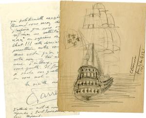 FARRÈRE Claude (Frédéric-Charles Bargone, dit)Dessin autographe signé. 1925 ; 1 page in-8°. Dessin au crayon noir, représentant un galion du XVIIe siècle, exécuté pendant la séance du Comité de la Société des gens de lettres, le 15 décembre 1925.On joint une lettre autographe signée, adressée à Gérard Bauer. « Jeudi 16 janvier 1948 » ; 4 pages in-8°, en-tête de l’Académie Française. « Il est exact qu’il y a une dizaine d’années j’ai écrit à ce Morenil que c’était une honte pour les lettres qu’un de ses servants — malheureux — fut réduit à la misère totale. Après quoi tant et tant de pauvres diables n’auraient poursuivi de démarches et de supplications. Lui, non. Il ne me relança jamais (et je n’affirmerais même pas qu’à ce mot de compassion, indignée, que je lui avais envoyé, j’eusse joint un secours matériel quelconque ?). La lettre que je vous communique ci-jointe (avec l’introduction tapée que lui-même a jointe à sa lettre), constitue le premier signe de vie que j’ai de lui depuis cette dizaine d’années qu’il me rappelle. Cher Gérard Bauer, les G de L peuvent-ils faire quelque chose pour ce malheureux qui demande en somme peu de chose ... (quoique, de nos jours les dactylos attachant leurs moindres chiens avec des saucisses, cela n’est pas rien, de faire taper 250 pages à 100 exemplaires, et de brocher le tout...). Et, pourtant un octogénaire qui renonce à planter chez l’imprimeur et n’ambitionne que de bâtir chez Ronéo, cela m’émeut... »