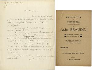 BEAUDIN AndréLettre autographe signée, adressée au critique dart Georges Boudaille. Paris 25 juillet 1954 ; 1 page in-4°. « En réponse à votre enquête je joins à ma lettre un catalogue de ma première exposition 1923 à la galerie Percier, avec une préface de Max Jacob.La galerie Percier était dirigée par Monsieur André Level.Au vernissage, jai connu Picasso, qui, dès ce moment, ma apporté son appui et son estime ; peu après jai rencontré chez Max Jacob, Juan Gris, qui est devenu immédiatement mon conseiller et mon ami.Cest à la même époque, et par Juan Gris dailleurs, que jai fait la connaissance de Maurice Raynal dont la parfaite compréhension ma toujours été précieuse. »On joint le catalogue mentionné dans la lettre.