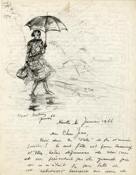 BERTREUX EdmondLettre autographe signée, adressée à M. Preteseille, avec dessin à lencre représentant une jeune femme à lencre sous un parapluie. Nantes, 4 janvier 1966 ; 2 pages in-4°. « Voici donc les fêtes de fin dannée passées ! Le mot fête est pour beaucoup dêtres, hélas dépourvu de vrai sens et ne présentait pas de grande joie si ce nétait la plus belle de se retrouver heureux au sein de sa famille et parmi de rares mais fidèles amis »