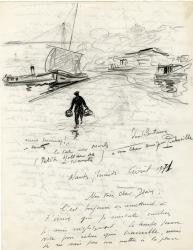 BERTREUX EdmondLettre autographe signée, adressée à M. Preteseille, avec dessin à la mine de plomb, représentant la cale aux moules (Petite Hollande de Nantes). « Nantes, mardi, avril 1971 » ; 2 pages in-4°. « Cest toujours en remettant à técrire que je constate combien je suis négligeant. Le temps passe vite pour celui qui travaille, mais je ne sais pas me mettre à la place dun bon ami qui se trouve seul dans une ville éloignée de la sienne et loin des siens ! Ah, ce nest pas que je ne pense pas à toi mon cher Jean, mais je naime plus écrire. Depuis notre dernière entrevue si agréable et ma petite exposition place Royale, jai beaucoup travaillé. Je suis assez satisfait ; reviens à mes 1res amours, à savoir : les bords de la Loire depuis lentrée du port de Nantes, à Trentemoult où va toute ma nostalgie et tant de souvenirs denfance ! Les paysages senlaidissent pourtant mais les ciels tourmentés au cumulus lourds & gris et leau si particulière du fleuve me va droit au coeur. Je pense avoir égalé ta toile du Port avec le Roquio et la tour à aloses (avec), lembarcadère à Trentemoult, les Roquio, la grève à Trentemoult, le séminaire des Couêts, paysage dhiver à Saint-Jean de Boiseau, etc, etc. Jai fait aussi une escapade en Brière dont jai rapporté des études également. Les temps sont durs pour les artistes profondément épris de leur art. Nous vivons une époque de fous... Mais que de consolations suscitées par lArt !! Il y a aussi la sympathie des rares amis. La tienne mest bien agréable et réconfortante mon cher Jean ».Jean Preteseille : critique musical, musicologue, cofondateur de la revue Diapason.