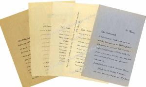 BOIS JulesEnsemble de 11 lettres autographes signées, dont 4 adressées au poète Auguste Dorchain, 4 au comédien Victor Boucher, et 1 à André Maurel. De 1901 à 1913 ; formats in-8° principalement. Demandes de rendez-vous à ses correspondants pour des séances de travail.— « Mon cher poète, voici quelques vers avec mes meilleurs vœux de succès. Je pars pour l’Inde et serai rentré à Paris dans deux mois. »— « Ne m’oubliez pas pour le prix Chauchard et merci de votre charmante promesse. Maurice Donnay est chaleureusement acquis. »— « Il est vraiment nécessaire de nous voir. Voulez-vous me faire le grand plaisir de venir déjeuner chez moi demain matin mercredi midi. »— « Me ferez-vous l’honneur de venir déjeuner demain matin vendredi ? »— « Je reçois un télégramme des directeurs du théâtre antique d’Orange me demandant de vous télégraphier qu’ils acceptent la combinaison Alexandre. »— « Je viens d’écrire à Clemenceau pour lui demander de nous autoriser d’écrire une chronique sur la thèse de l’Eternel Retour, traitée auparavant par Goethe, Nietzsche, Blanqui, Gustave Le Bon. »