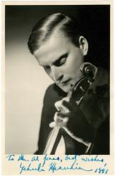 MENUHIN YehudiPhotographie signée. 17,7 X 11,5 cm, traces de papier collé au dos. Cachet du photographe : studio Annemarie Heinrich à Buenos Aires. Photographie du jeune violoniste dédicacée à l’encre bleue : « To Mr. Al Jonas, best wishes, Yehudi Menuhin, 1943. »