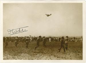 COSTESPhotographie signée. 18 X 13 cm. Photographie du New York Times montrant la foule qui court au devant de lappareil qui est prêt à atterrir à Rio de Janeiro en avril 1928.On joint une carte postale montrant Costes et Le Brix, dans leur avion, au départ de leur tour du monde (57 000 km) et deux autres cartes postales.