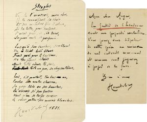 COURTELINE Georges (Georges Moinaux, dit)Poème autographe signé, intitulé « Strophes ». 1881 ; 1 page in-8°. « Un, tu l'aimerais, mon cher, Si tu connaissais sa chair Et ses membres fins Si la belle pour coussins, L'avait prêté de ses reins La peau mate et parfumée. Lorsqu'à son coucher, semblant Un idéal bébé blanc Frais, paré pour le baptême De ses jupons délavés Monte cette odeur, tu sais Forte un peu, de chrysanthème, Lors, s'il pouvait ton bras nu Cercler son ventre charnu, En gorge tiède ou ses jambes, Tu verrais si son baiser Vaut qu'on se laisse écraser Le coeur entre ses mains blanches. » On joint une lettre autographe signée évoquant les Gaités de l'Escadron .