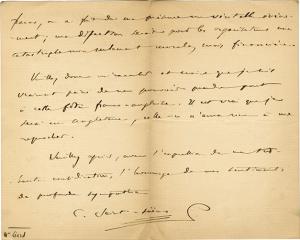 SAINT-SAËNS CamilleLettre autographe signée, adressée à Louis Liard. Bordighera, 13 mars 1907 ; 3 pages in-8°. Il regrette de ne pouvoir prendre part à la fête franco-anglaise : « Un engagement contracté l'an dernier me forcera à aller en Écosse au mois de mai. J'avais espéré pouvoir me dégager, mais les choses se présentent de telle manière que je suis forcé de m'exécuter. On m'a annoncé à grand fracas, on a fait de ma présence un véritable événement, ma défection serait pour les organisateurs une catastrophe non seulement morale, mais financière. »