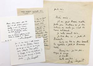 SAUGUET Henri (Henri Poupart, dit)Ensemble de 2 cartes et 2 lettres autographes signées, adressées à Nina Vyroubova, danseuse étoile de l'Opéra de Paris : Carte autographe signée. « Boulevard de Clichy, le 29 novembre 1973 ». « Boris Kochno n'avait déjà amené votre projet : c'est, vous le pensez, avec le plus grand plaisir que je vous donne l'autorisation souhaitée. Et ce sera pour moi une grande joie que de vous revoir à cette occasion et de voir nos Forains traduits par vous qui en avez été une des plus belles interprètes (sans oublier les Mirages où vous étiez sublime). » Carte autographe signée avec portée musicale d'un extrait des Forains au dos. 31 décembre 1977 ; 1 page in-12. « Merci, chère amie, pour vos vux et votre fidèle pensée : veuillez à votre tour recevoir tout ce que je vous adresse pour une belle et brillante année 1978 avec les souvenirs affectueux de votre musicien des Mirages et des Forains. » Lettre autographe signée. « Vendredi soir », 1 page in-8°. « On ne peux pas avoir de répétitions avec l'orchestre ce samedi matin, une partie des musiciens étant indisponible. Nous répéterons cet après-midi, à partir de 3 h-3 h 1/4, la partie concert sera répétée avant. Mais on peut régler le matin les éclairages et les rideaux. » Lettre autographe signée. « Jeudi soir »] ; 1 page in-4°. Rentrant d'un enterrement à Bordeaux, il demande : « Voulez-vous bien me faire soumettre les répétitions à partir de dimanche matin. »