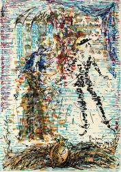 DUPONT JacquesDessin aux feutres de couleurs représentant deux personnages dans une scène de théâtre, signé et daté. 1963 ; 34 X 24 cm. Ce dessin provient du fonds de Maurice Escande, ancien directeur de la Comédie française.